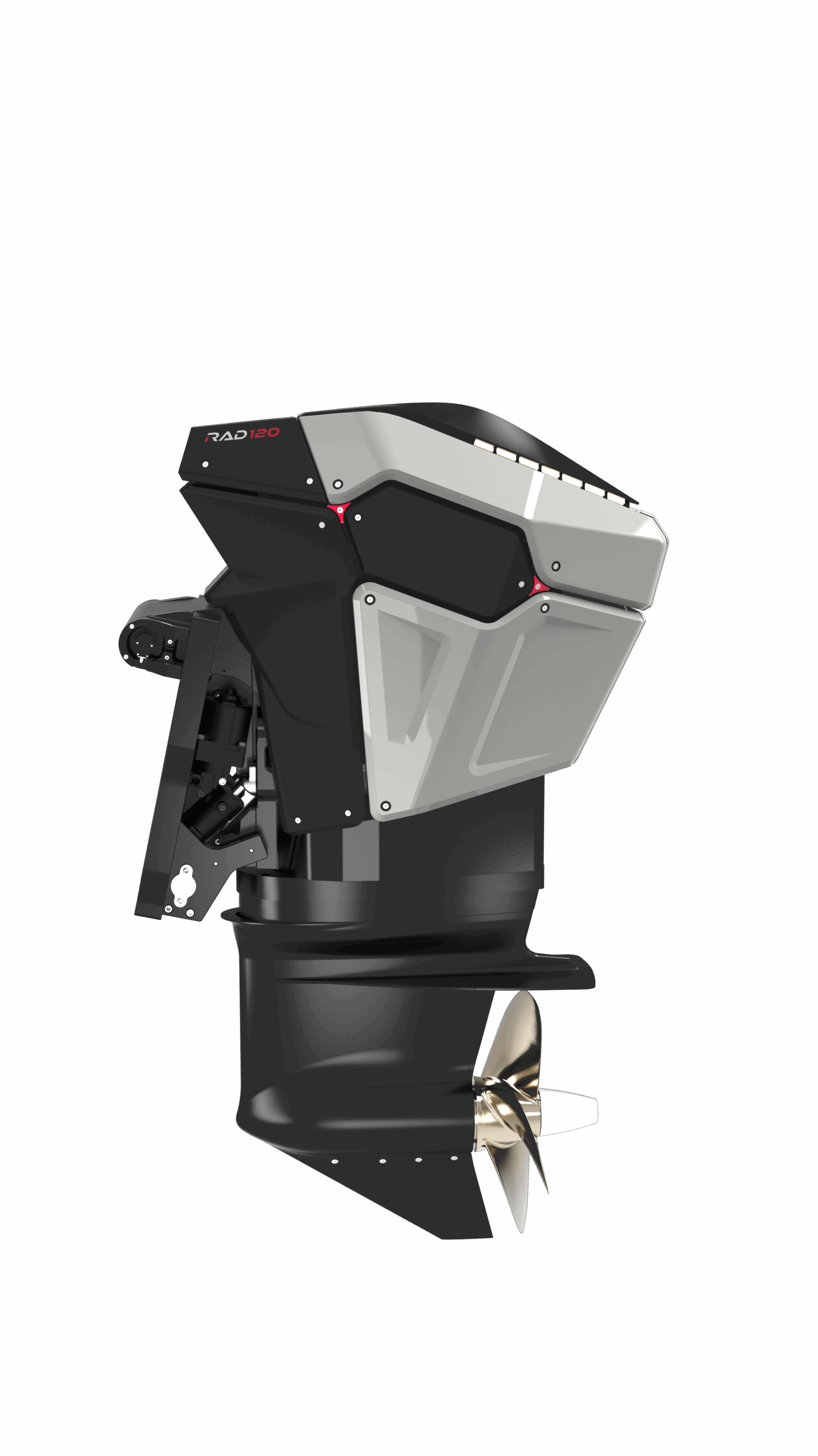 Despite the higher power class, the RAD 120 is engineered so that the outboard remains behind the transom when tilted up, preserving deck space.